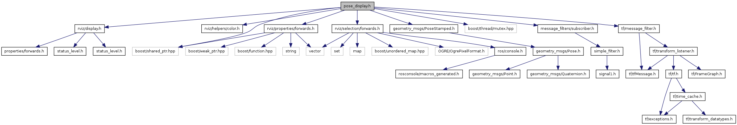 #include "rviz/display.h"#include "rviz/helpers/color.h"#include "rviz/properties/forwards.h"#include "rviz/selection/forwards.h"#include <geometry_msgs/PoseStamped.h>#include <boost/shared_ptr.hpp>#include <boost/thread/mutex.hpp>#include <message_filters/subscriber.h>#include <tf/message_filter.h>