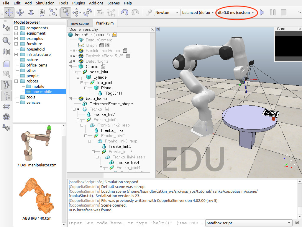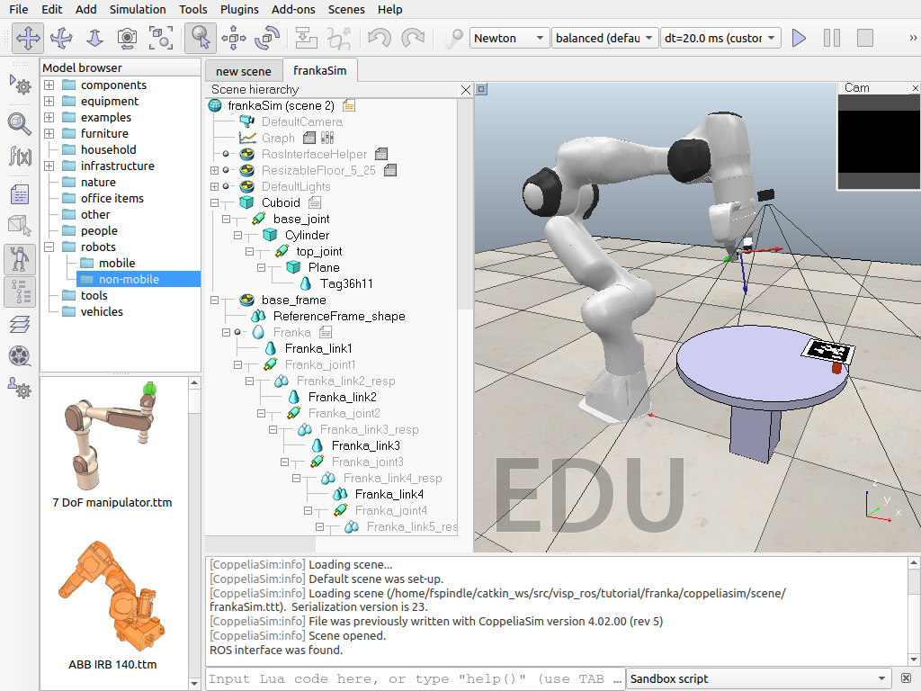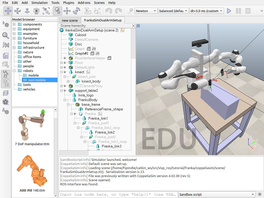 [sandboxScript:info] Simulator launched, welcome! [CoppeliaSim:loadinfo] checking for an updated CoppeliaSim version... [CoppeliaSim:loadinfo] This CoppeliaSim version is up-to-date. [CoppeliaSim:info] Loading scene... [CoppeliaSim:info] Default scene was set-up. [CoppeliaSim:info] Loading scene (/home/user/catkin_ws/src/visp_ros/tutorial/franka/coppeliasim/scene/frankaSim.ttt). Serialization version is 23. [CoppeliaSim:info] File was previously written with CoppeliaSim version 4.02.00 (rev 5) [CoppeliaSim:info] Scene opened. ROS interface was found.