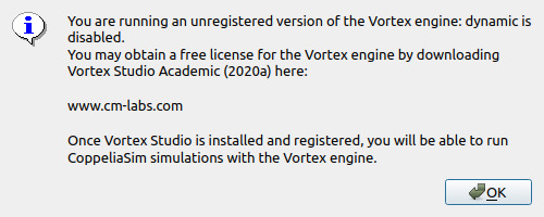 $ cd ~/software/CoppeliaSim_Edu_V4_2_0_Ubuntu18_04 (or CoppeliaSim_Edu_V4_2_0_Ubuntu20_04) $ cp vortexPlugin/* .Now if you run again the simulation a new popup should appear in CoppeliaSim