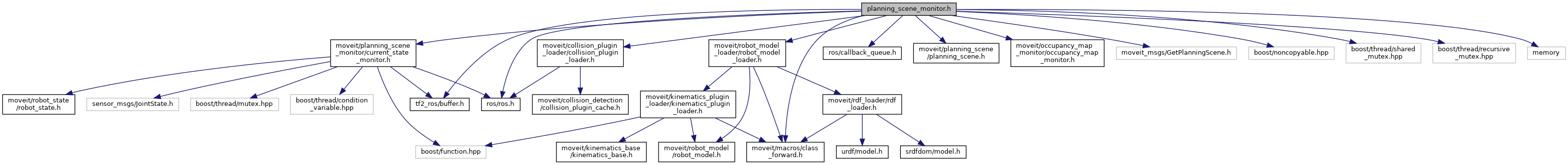 #include <ros/ros.h>#include <ros/callback_queue.h>#include <tf2_ros/buffer.h>#include <moveit/macros/class_forward.h>#include <moveit/planning_scene/planning_scene.h>#include <moveit/robot_model_loader/robot_model_loader.h>#include <moveit/occupancy_map_monitor/occupancy_map_monitor.h>#include <moveit/planning_scene_monitor/current_state_monitor.h>#include <moveit/collision_plugin_loader/collision_plugin_loader.h>#include <moveit_msgs/GetPlanningScene.h>#include <boost/noncopyable.hpp>#include <boost/thread/shared_mutex.hpp>#include <boost/thread/recursive_mutex.hpp>#include <memory>