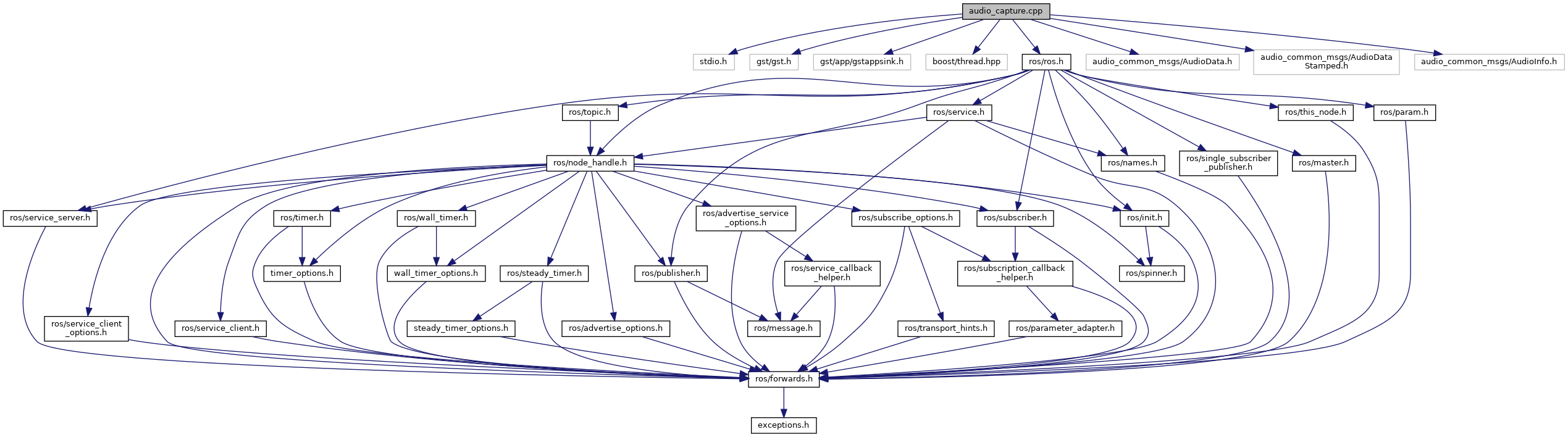 #include <stdio.h>#include <gst/gst.h>#include <gst/app/gstappsink.h>#include <boost/thread.hpp>#include <ros/ros.h>#include "audio_common_msgs/AudioData.h"#include "audio_common_msgs/AudioDataStamped.h"#include "audio_common_msgs/AudioInfo.h"