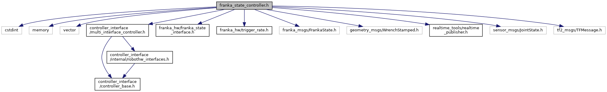 #include <cstdint>#include <memory>#include <vector>#include <controller_interface/multi_interface_controller.h>#include <franka_hw/franka_state_interface.h>#include <franka_hw/trigger_rate.h>#include <franka_msgs/FrankaState.h>#include <geometry_msgs/WrenchStamped.h>#include <realtime_tools/realtime_publisher.h>#include <sensor_msgs/JointState.h>#include <tf2_msgs/TFMessage.h>