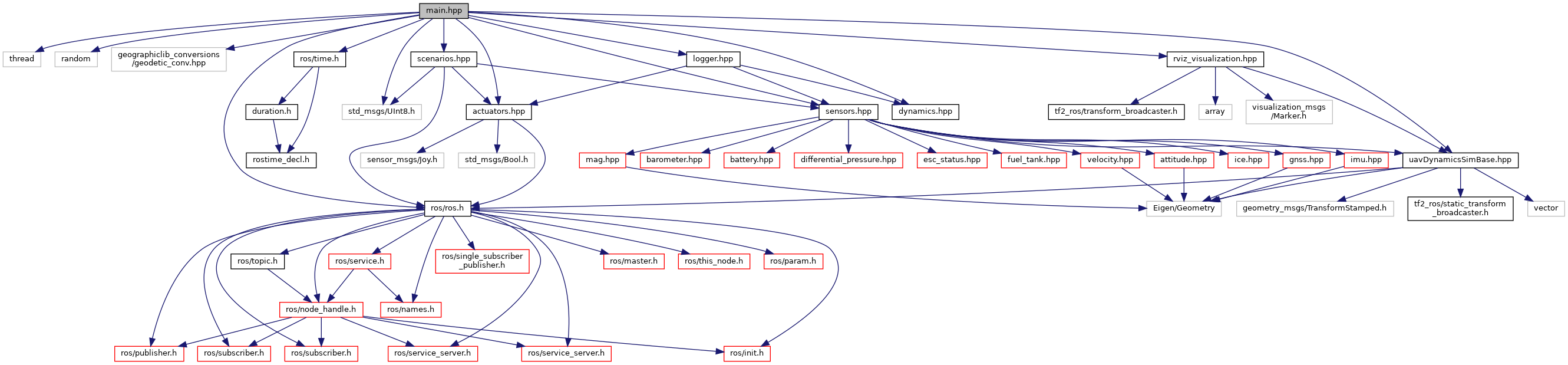 #include <thread>#include <random>#include <geographiclib_conversions/geodetic_conv.hpp>#include <ros/ros.h>#include <ros/time.h>#include <std_msgs/UInt8.h>#include "uavDynamicsSimBase.hpp"#include "dynamics.hpp"#include "actuators.hpp"#include "sensors.hpp"#include "scenarios.hpp"#include "logger.hpp"#include "rviz_visualization.hpp"