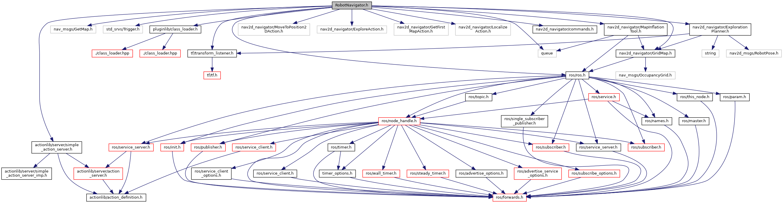 #include <ros/ros.h>#include <nav_msgs/GetMap.h>#include <std_srvs/Trigger.h>#include <tf/transform_listener.h>#include <actionlib/server/simple_action_server.h>#include <pluginlib/class_loader.h>#include <nav2d_navigator/MoveToPosition2DAction.h>#include <nav2d_navigator/ExploreAction.h>#include <nav2d_navigator/GetFirstMapAction.h>#include <nav2d_navigator/LocalizeAction.h>#include <nav2d_navigator/GridMap.h>#include <nav2d_navigator/commands.h>#include <nav2d_navigator/MapInflationTool.h>#include <nav2d_navigator/ExplorationPlanner.h>#include <queue>