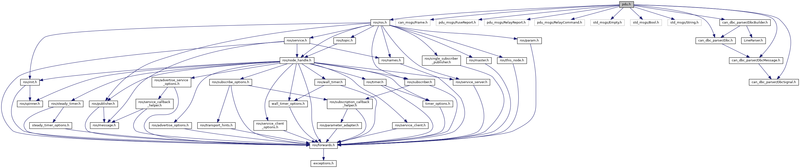 #include <ros/ros.h>#include <can_msgs/Frame.h>#include <pdu_msgs/FuseReport.h>#include <pdu_msgs/RelayReport.h>#include <pdu_msgs/RelayCommand.h>#include <std_msgs/Empty.h>#include <std_msgs/Bool.h>#include <std_msgs/String.h>#include <can_dbc_parser/DbcMessage.h>#include <can_dbc_parser/DbcSignal.h>#include <can_dbc_parser/Dbc.h>#include <can_dbc_parser/DbcBuilder.h>