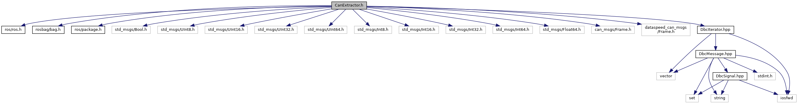 #include <ros/ros.h>#include <rosbag/bag.h>#include <ros/package.h>#include <std_msgs/Bool.h>#include <std_msgs/UInt8.h>#include <std_msgs/UInt16.h>#include <std_msgs/UInt32.h>#include <std_msgs/UInt64.h>#include <std_msgs/Int8.h>#include <std_msgs/Int16.h>#include <std_msgs/Int32.h>#include <std_msgs/Int64.h>#include <std_msgs/Float64.h>#include <can_msgs/Frame.h>#include <dataspeed_can_msgs/Frame.h>#include "DbcIterator.hpp"