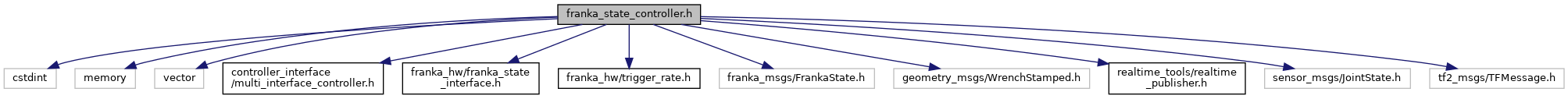 #include <cstdint>#include <memory>#include <vector>#include <controller_interface/multi_interface_controller.h>#include <franka_hw/franka_state_interface.h>#include <franka_hw/trigger_rate.h>#include <franka_msgs/FrankaState.h>#include <geometry_msgs/WrenchStamped.h>#include <realtime_tools/realtime_publisher.h>#include <sensor_msgs/JointState.h>#include <tf2_msgs/TFMessage.h>