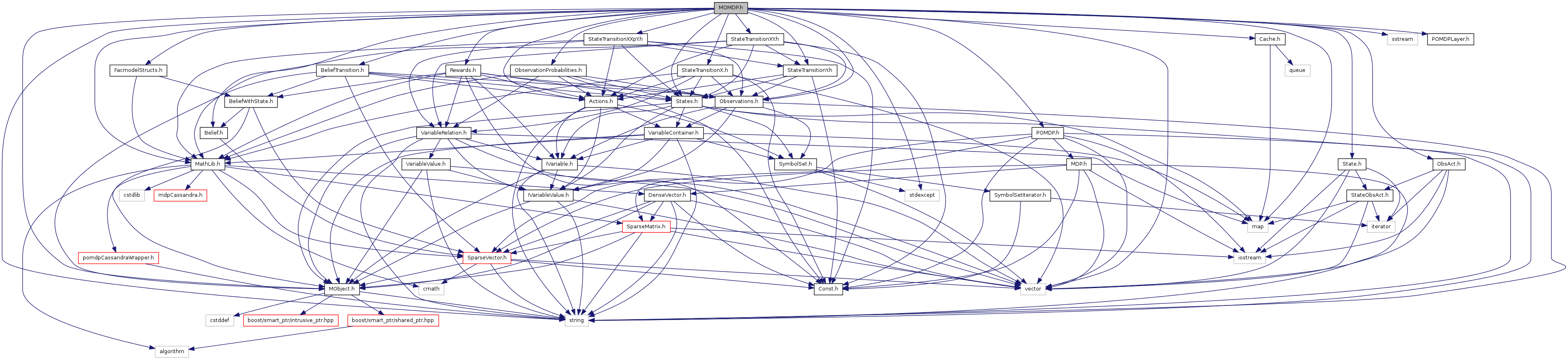 #include <string>#include <vector>#include <map>#include <sstream>#include <stdexcept>#include "Observations.h"#include "Actions.h"#include "States.h"#include "Rewards.h"#include "ObservationProbabilities.h"#include "StateTransitionX.h"#include "StateTransitionXY.h"#include "StateTransitionXXpY.h"#include "StateTransitionY.h"#include "Belief.h"#include "BeliefTransition.h"#include "POMDP.h"#include "MObject.h"#include "MathLib.h"#include "FacmodelStructs.h"#include "POMDPLayer.h"#include "State.h"#include "ObsAct.h"#include "Cache.h"