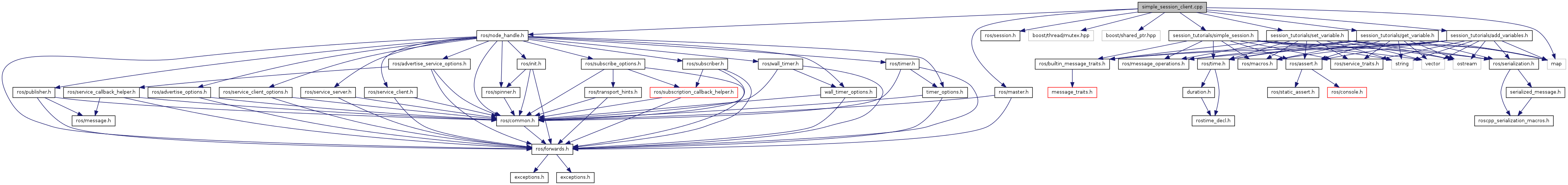 #include <ros/node_handle.h>#include <ros/master.h>#include <ros/session.h>#include <boost/thread/mutex.hpp>#include <boost/shared_ptr.hpp>#include "session_tutorials/simple_session.h"#include "session_tutorials/set_variable.h"#include "session_tutorials/get_variable.h"#include "session_tutorials/add_variables.h"#include <map>