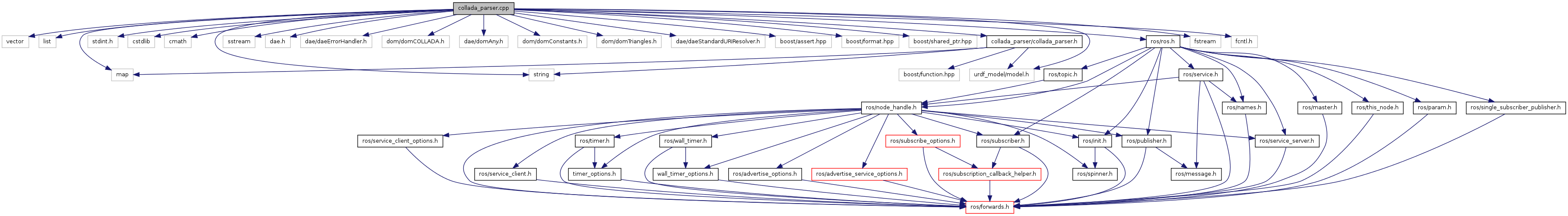 #include <vector>#include <list>#include <map>#include <stdint.h>#include <cstdlib>#include <cmath>#include <string>#include <sstream>#include <dae.h>#include <dae/daeErrorHandler.h>#include <dom/domCOLLADA.h>#include <dae/domAny.h>#include <dom/domConstants.h>#include <dom/domTriangles.h>#include <dae/daeStandardURIResolver.h>#include <boost/assert.hpp>#include <boost/format.hpp>#include <boost/shared_ptr.hpp>#include <ros/ros.h>#include <collada_parser/collada_parser.h>#include <urdf_model/model.h>#include <fstream>#include <fcntl.h>
