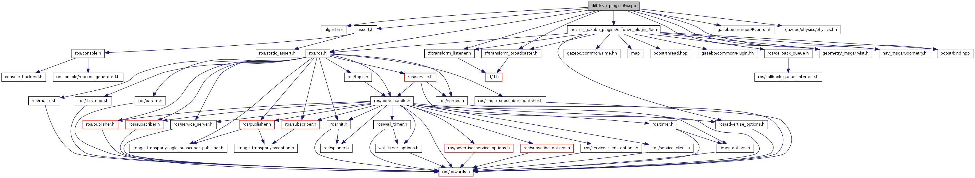 #include <algorithm>#include <assert.h>#include <hector_gazebo_plugins/diffdrive_plugin_6w.h>#include <gazebo/common/Events.hh>#include <gazebo/physics/physics.hh>#include <ros/ros.h>#include <tf/transform_broadcaster.h>#include <tf/transform_listener.h>#include <geometry_msgs/Twist.h>#include <nav_msgs/Odometry.h>#include <boost/bind.hpp>