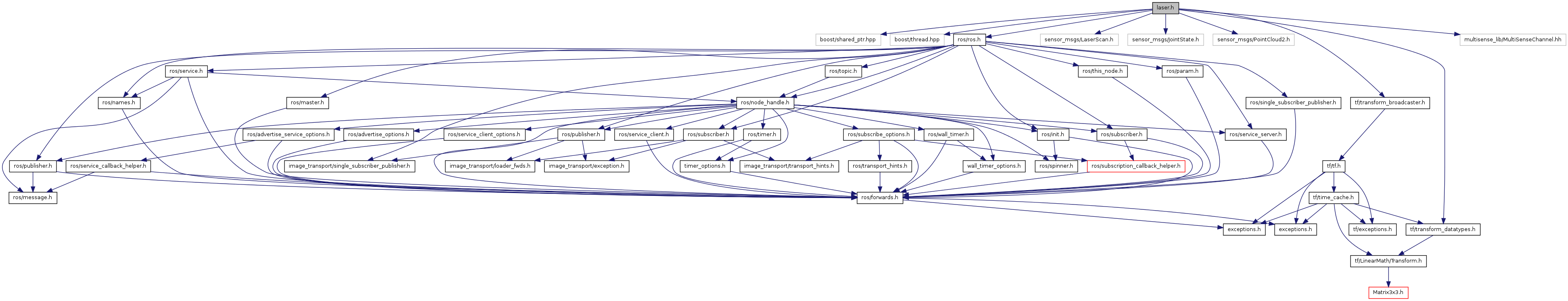 #include <boost/shared_ptr.hpp>#include <boost/thread.hpp>#include <ros/ros.h>#include <sensor_msgs/LaserScan.h>#include <sensor_msgs/JointState.h>#include <sensor_msgs/PointCloud2.h>#include <tf/transform_datatypes.h>#include <tf/transform_broadcaster.h>#include <multisense_lib/MultiSenseChannel.hh>