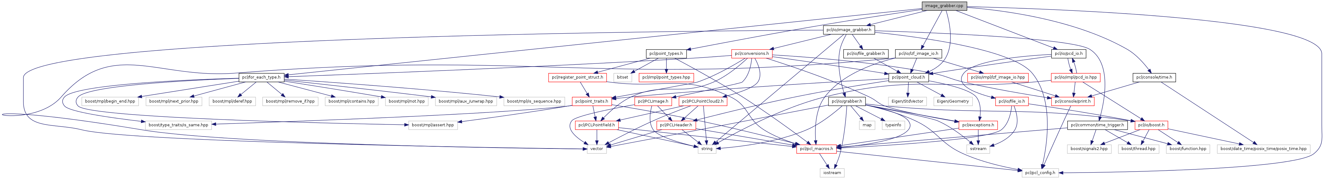 #include <pcl/pcl_config.h>#include <pcl/io/image_grabber.h>#include <pcl/point_cloud.h>#include <pcl/point_types.h>#include <pcl/io/pcd_io.h>#include <pcl/for_each_type.h>#include <pcl/io/lzf_image_io.h>#include <pcl/console/time.h>