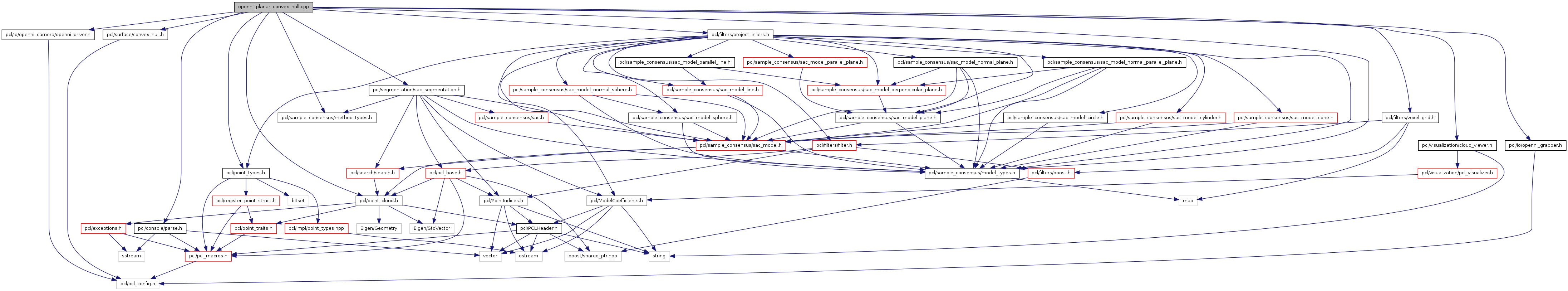 #include <pcl/point_cloud.h>#include <pcl/point_types.h>#include <pcl/io/openni_grabber.h>#include <pcl/visualization/cloud_viewer.h>#include <pcl/io/openni_camera/openni_driver.h>#include <pcl/console/parse.h>#include <pcl/sample_consensus/method_types.h>#include <pcl/sample_consensus/model_types.h>#include <pcl/segmentation/sac_segmentation.h>#include <pcl/filters/voxel_grid.h>#include <pcl/filters/project_inliers.h>#include <pcl/surface/convex_hull.h>