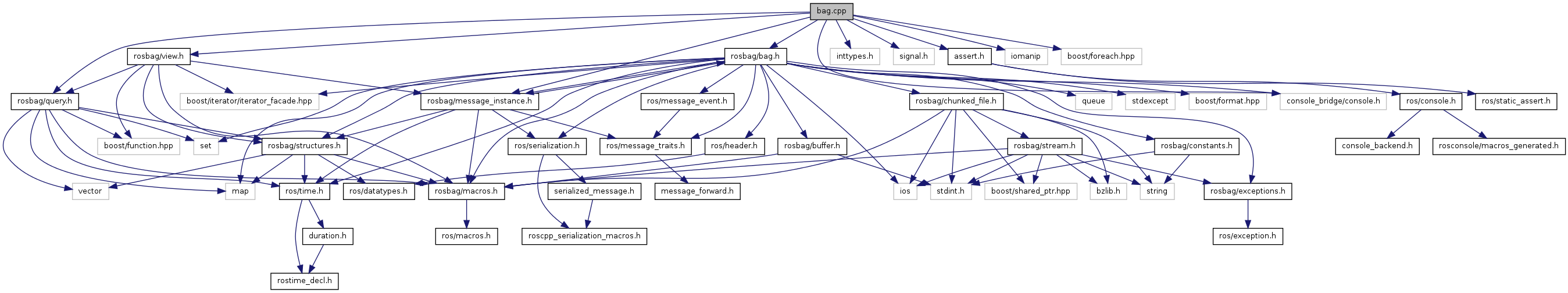 #include "rosbag/bag.h"#include "rosbag/message_instance.h"#include "rosbag/query.h"#include "rosbag/view.h"#include <inttypes.h>#include <signal.h>#include <assert.h>#include <iomanip>#include <boost/foreach.hpp>#include "console_bridge/console.h"