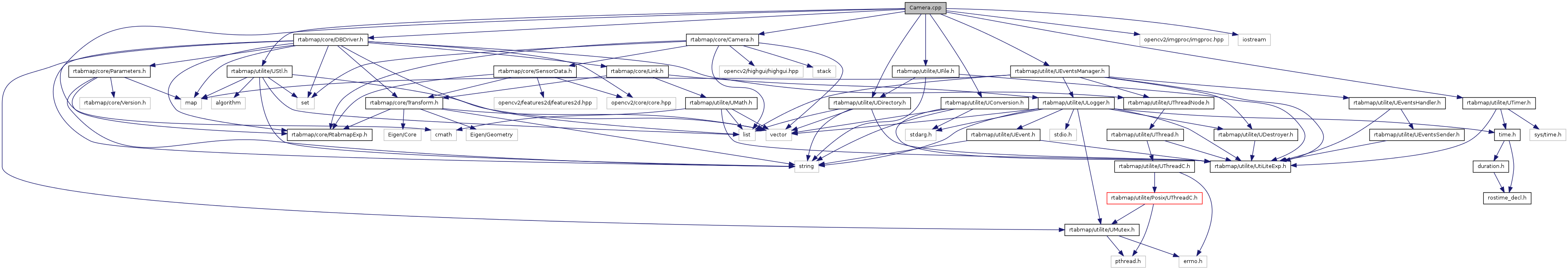 #include "rtabmap/core/Camera.h"#include "rtabmap/core/DBDriver.h"#include <rtabmap/utilite/UEventsManager.h>#include <rtabmap/utilite/UConversion.h>#include <rtabmap/utilite/UStl.h>#include <rtabmap/utilite/UFile.h>#include <rtabmap/utilite/UDirectory.h>#include <rtabmap/utilite/UTimer.h>#include <opencv2/imgproc/imgproc.hpp>#include <iostream>#include <cmath>