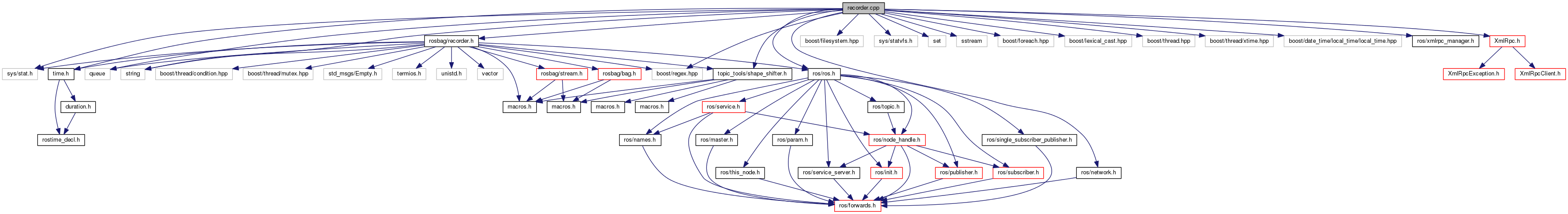 #include "rosbag/recorder.h"#include <sys/stat.h>#include <boost/filesystem.hpp>#include <sys/statvfs.h>#include <time.h>#include <queue>#include <set>#include <sstream>#include <string>#include <boost/foreach.hpp>#include <boost/lexical_cast.hpp>#include <boost/regex.hpp>#include <boost/thread.hpp>#include <boost/thread/xtime.hpp>#include <boost/date_time/local_time/local_time.hpp>#include <ros/ros.h>#include <topic_tools/shape_shifter.h>#include "ros/network.h"#include "ros/xmlrpc_manager.h"#include "XmlRpc.h"