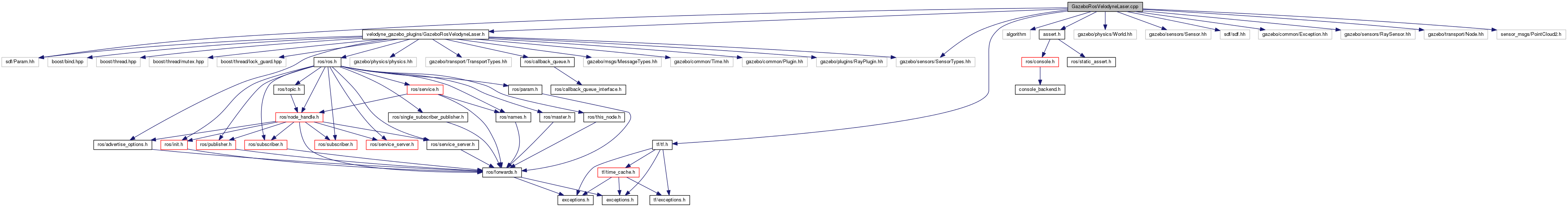#include <velodyne_gazebo_plugins/GazeboRosVelodyneLaser.h>#include <algorithm>#include <assert.h>#include <gazebo/physics/World.hh>#include <gazebo/sensors/Sensor.hh>#include <sdf/sdf.hh>#include <sdf/Param.hh>#include <gazebo/common/Exception.hh>#include <gazebo/sensors/RaySensor.hh>#include <gazebo/sensors/SensorTypes.hh>#include <gazebo/transport/Node.hh>#include <sensor_msgs/PointCloud2.h>#include <tf/tf.h>