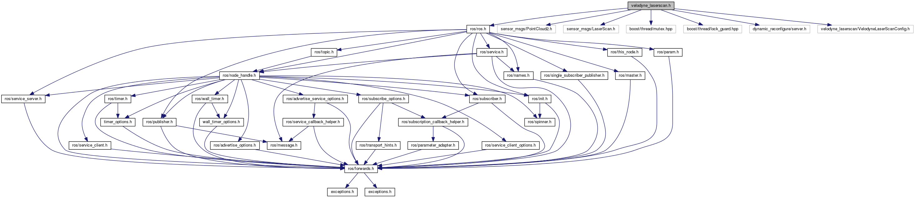 #include <ros/ros.h>#include <sensor_msgs/PointCloud2.h>#include <sensor_msgs/LaserScan.h>#include <boost/thread/mutex.hpp>#include <boost/thread/lock_guard.hpp>#include <dynamic_reconfigure/server.h>#include <velodyne_laserscan/VelodyneLaserScanConfig.h>