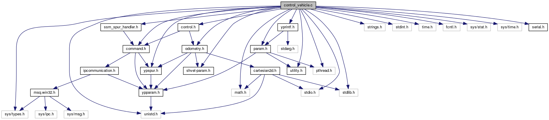 #include <math.h>#include <stdio.h>#include <strings.h>#include <unistd.h>#include <stdint.h>#include <stdlib.h>#include <time.h>#include <fcntl.h>#include <sys/stat.h>#include <sys/time.h>#include <sys/types.h>#include <shvel-param.h>#include <serial.h>#include <param.h>#include <control.h>#include <command.h>#include <utility.h>#include <yprintf.h>#include <odometry.h>#include <ssm_spur_handler.h>#include <ypspur.h>#include <pthread.h>