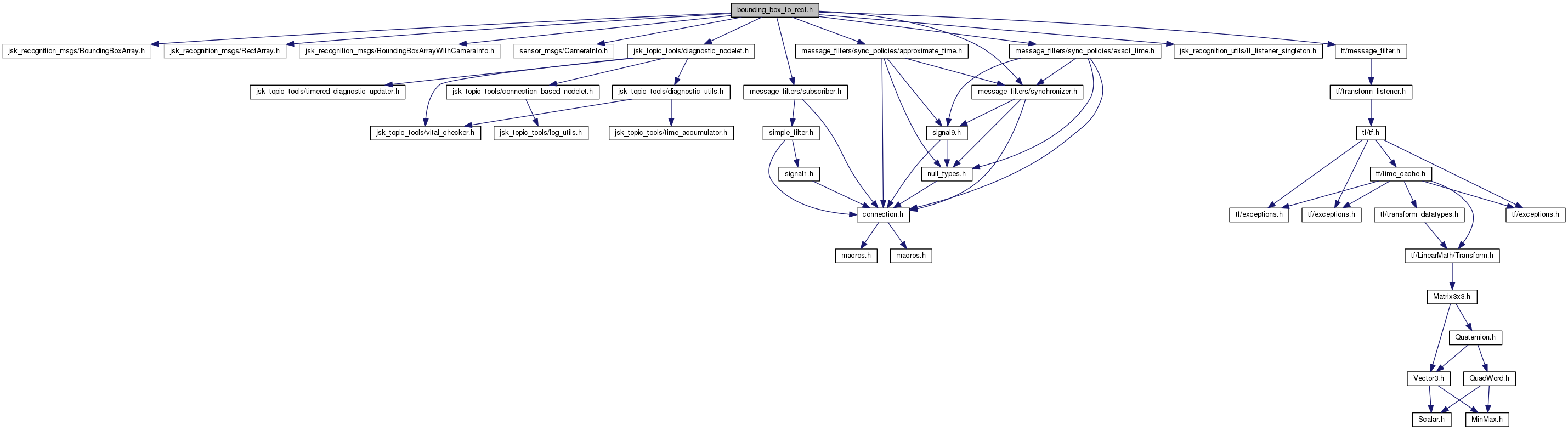 #include <jsk_recognition_msgs/BoundingBoxArray.h>#include <jsk_recognition_msgs/RectArray.h>#include <jsk_recognition_msgs/BoundingBoxArrayWithCameraInfo.h>#include <sensor_msgs/CameraInfo.h>#include <jsk_topic_tools/diagnostic_nodelet.h>#include <message_filters/subscriber.h>#include <message_filters/synchronizer.h>#include <message_filters/sync_policies/exact_time.h>#include <message_filters/sync_policies/approximate_time.h>#include <jsk_recognition_utils/tf_listener_singleton.h>#include <tf/message_filter.h>