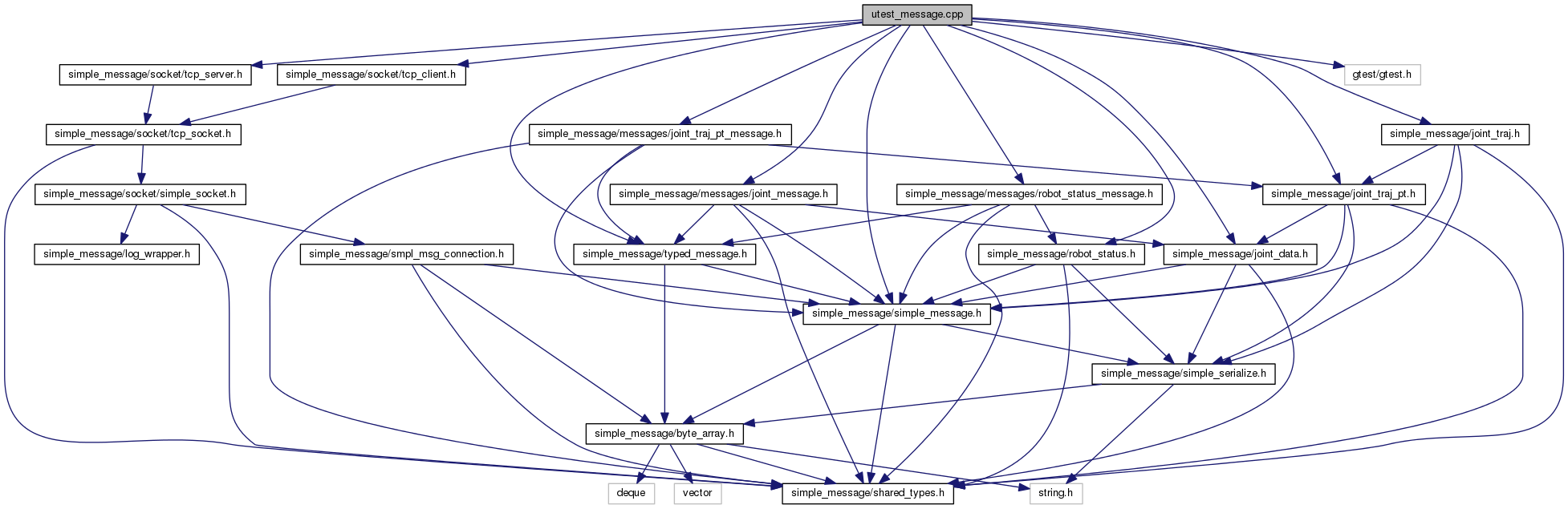 #include "simple_message/simple_message.h"#include "simple_message/socket/tcp_client.h"#include "simple_message/socket/tcp_server.h"#include "simple_message/messages/joint_message.h"#include "simple_message/joint_data.h"#include "simple_message/joint_traj_pt.h"#include "simple_message/messages/joint_traj_pt_message.h"#include "simple_message/typed_message.h"#include "simple_message/joint_traj.h"#include "simple_message/robot_status.h"#include "simple_message/messages/robot_status_message.h"#include <gtest/gtest.h>