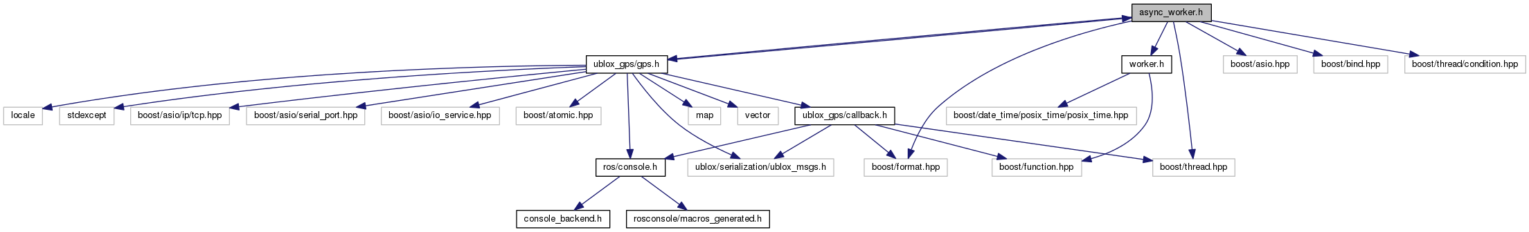 #include <ublox_gps/gps.h>#include <boost/asio.hpp>#include <boost/bind.hpp>#include <boost/format.hpp>#include <boost/thread.hpp>#include <boost/thread/condition.hpp>#include "worker.h"