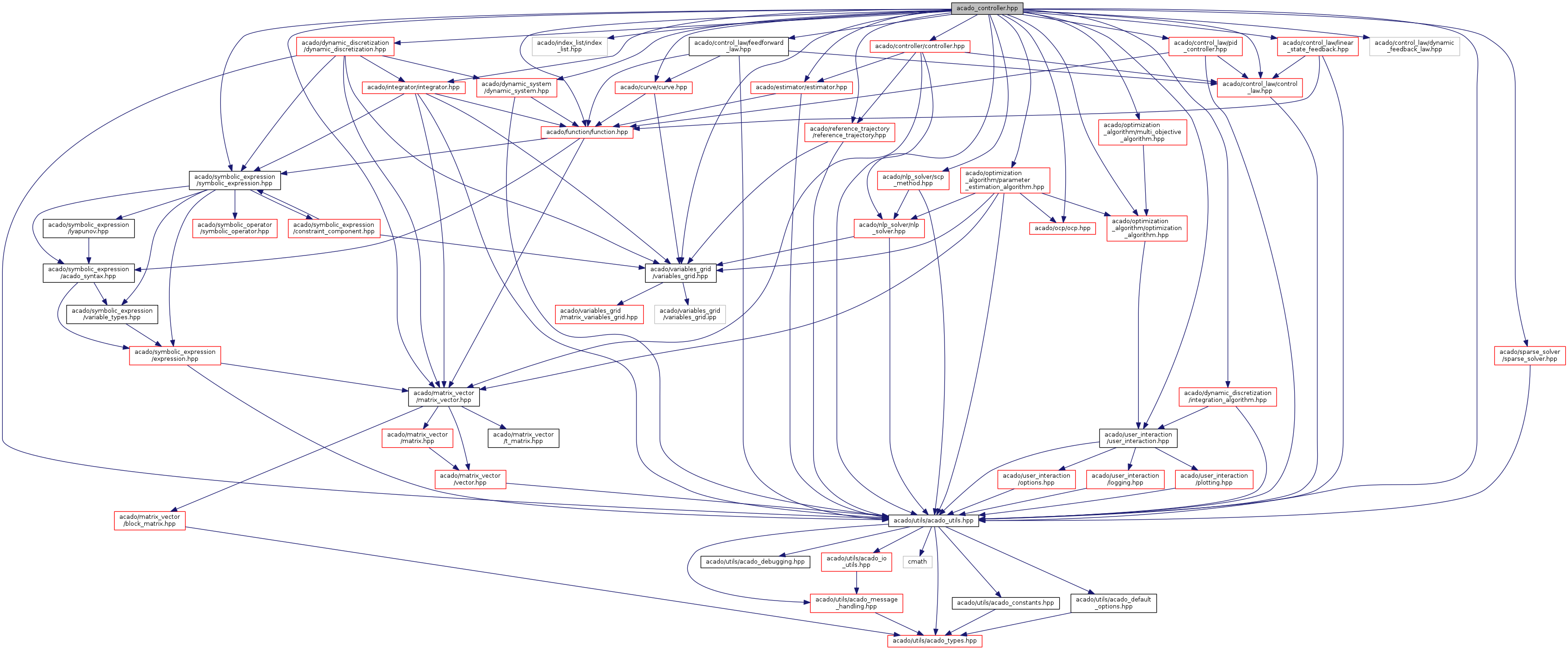 #include <acado/utils/acado_utils.hpp>#include <acado/user_interaction/user_interaction.hpp>#include <acado/matrix_vector/matrix_vector.hpp>#include <acado/variables_grid/variables_grid.hpp>#include <acado/index_list/index_list.hpp>#include <acado/symbolic_expression/symbolic_expression.hpp>#include <acado/function/function.hpp>#include <acado/integrator/integrator.hpp>#include <acado/sparse_solver/sparse_solver.hpp>#include <acado/dynamic_system/dynamic_system.hpp>#include <acado/dynamic_discretization/dynamic_discretization.hpp>#include <acado/dynamic_discretization/integration_algorithm.hpp>#include <acado/nlp_solver/nlp_solver.hpp>#include <acado/nlp_solver/scp_method.hpp>#include <acado/ocp/ocp.hpp>#include <acado/optimization_algorithm/optimization_algorithm.hpp>#include <acado/optimization_algorithm/parameter_estimation_algorithm.hpp>#include <acado/optimization_algorithm/multi_objective_algorithm.hpp>#include <acado/curve/curve.hpp>#include <acado/controller/controller.hpp>#include <acado/estimator/estimator.hpp>#include <acado/control_law/control_law.hpp>#include <acado/control_law/pid_controller.hpp>#include <acado/control_law/dynamic_feedback_law.hpp>#include <acado/control_law/linear_state_feedback.hpp>#include <acado/control_law/feedforward_law.hpp>#include <acado/reference_trajectory/reference_trajectory.hpp>