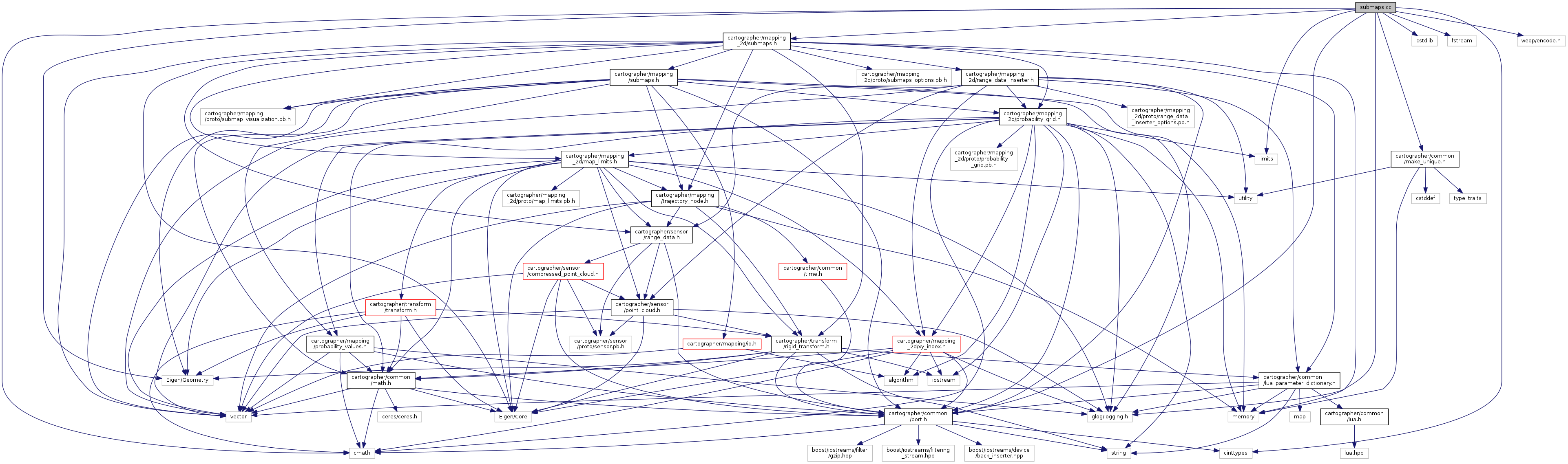 Include dependency graph for 2d/submaps.cc: