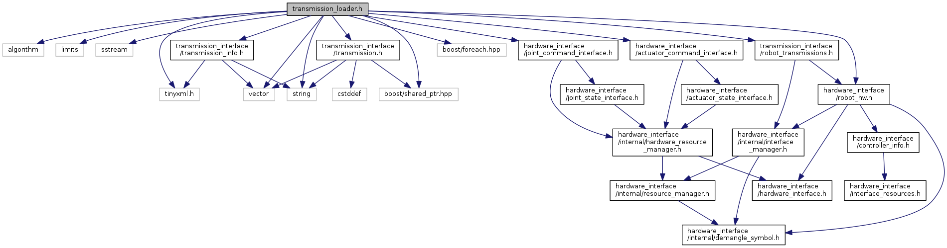 #include <algorithm>#include <limits>#include <sstream>#include <string>#include <vector>#include <boost/foreach.hpp>#include <boost/shared_ptr.hpp>#include <tinyxml.h>#include <hardware_interface/actuator_command_interface.h>#include <hardware_interface/joint_command_interface.h>#include <hardware_interface/robot_hw.h>#include <transmission_interface/robot_transmissions.h>#include <transmission_interface/transmission_info.h>#include <transmission_interface/transmission.h>
