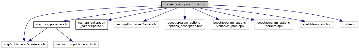 command line tool to convert a ViSP camera parameter file to a INI/YAML file compatible with ROS drivers More...