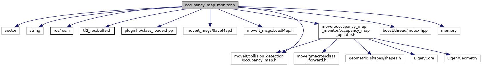 #include <vector>#include <string>#include <ros/ros.h>#include <tf2_ros/buffer.h>#include <pluginlib/class_loader.hpp>#include <moveit_msgs/SaveMap.h>#include <moveit_msgs/LoadMap.h>#include <moveit/collision_detection/occupancy_map.h>#include <moveit/occupancy_map_monitor/occupancy_map_updater.h>#include <boost/thread/mutex.hpp>#include <memory>