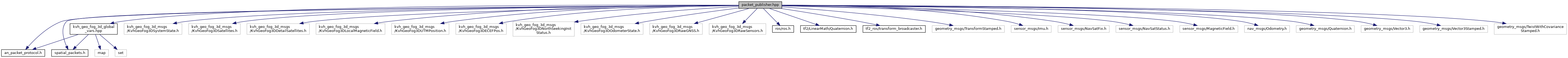 #include "an_packet_protocol.h"#include "spatial_packets.h"#include "kvh_geo_fog_3d_global_vars.hpp"#include <kvh_geo_fog_3d_msgs/KvhGeoFog3DSystemState.h>#include <kvh_geo_fog_3d_msgs/KvhGeoFog3DSatellites.h>#include <kvh_geo_fog_3d_msgs/KvhGeoFog3DDetailSatellites.h>#include <kvh_geo_fog_3d_msgs/KvhGeoFog3DLocalMagneticField.h>#include <kvh_geo_fog_3d_msgs/KvhGeoFog3DUTMPosition.h>#include <kvh_geo_fog_3d_msgs/KvhGeoFog3DECEFPos.h>#include <kvh_geo_fog_3d_msgs/KvhGeoFog3DNorthSeekingInitStatus.h>#include <kvh_geo_fog_3d_msgs/KvhGeoFog3DOdometerState.h>#include <kvh_geo_fog_3d_msgs/KvhGeoFog3DRawGNSS.h>#include <kvh_geo_fog_3d_msgs/KvhGeoFog3DRawSensors.h>#include <ros/ros.h>#include "tf2/LinearMath/Quaternion.h"#include <tf2_ros/transform_broadcaster.h>#include <geometry_msgs/TransformStamped.h>#include "sensor_msgs/Imu.h"#include "sensor_msgs/NavSatFix.h"#include "sensor_msgs/NavSatStatus.h"#include "sensor_msgs/MagneticField.h"#include "nav_msgs/Odometry.h"#include "geometry_msgs/Quaternion.h"#include "geometry_msgs/Vector3.h"#include "geometry_msgs/Vector3Stamped.h"#include "geometry_msgs/TwistWithCovarianceStamped.h"