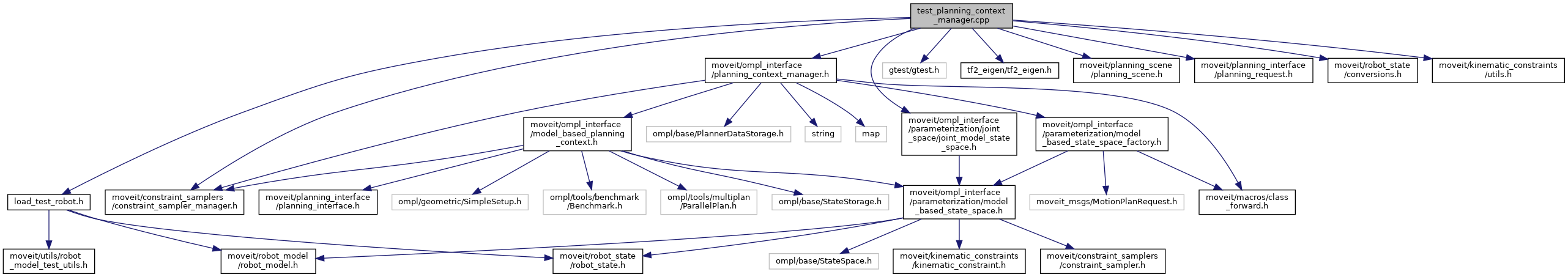 #include "load_test_robot.h"#include <gtest/gtest.h>#include <tf2_eigen/tf2_eigen.h>#include <moveit/ompl_interface/planning_context_manager.h>#include <moveit/planning_scene/planning_scene.h>#include <moveit/planning_interface/planning_request.h>#include <moveit/robot_state/conversions.h>#include <moveit/kinematic_constraints/utils.h>#include <moveit/constraint_samplers/constraint_sampler_manager.h>#include <moveit/ompl_interface/parameterization/joint_space/joint_model_state_space.h>