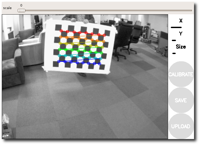 After a successful calibration, you can use the slider at the top of the calibration window to change the size of the rectified image. A scale of 0.0 means that the image is sized so that all pixels in the rectified image are valid. The rectified image has no border, but some pixels from the original image are discarded. A scale of 1.0 means that all pixels in the original image are visible, but the rectified image has black borders where there are no input pixels in the original image.