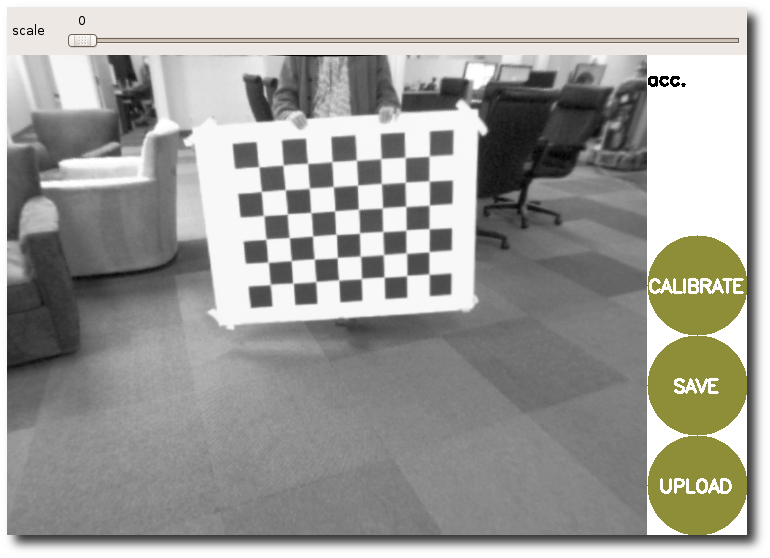 As you move the checkerboard around you will see three bars on the calibration sidebar increase in length. When the CALIBRATE button lights, you have enough data for calibration and can click CALIBRATE to see the results.