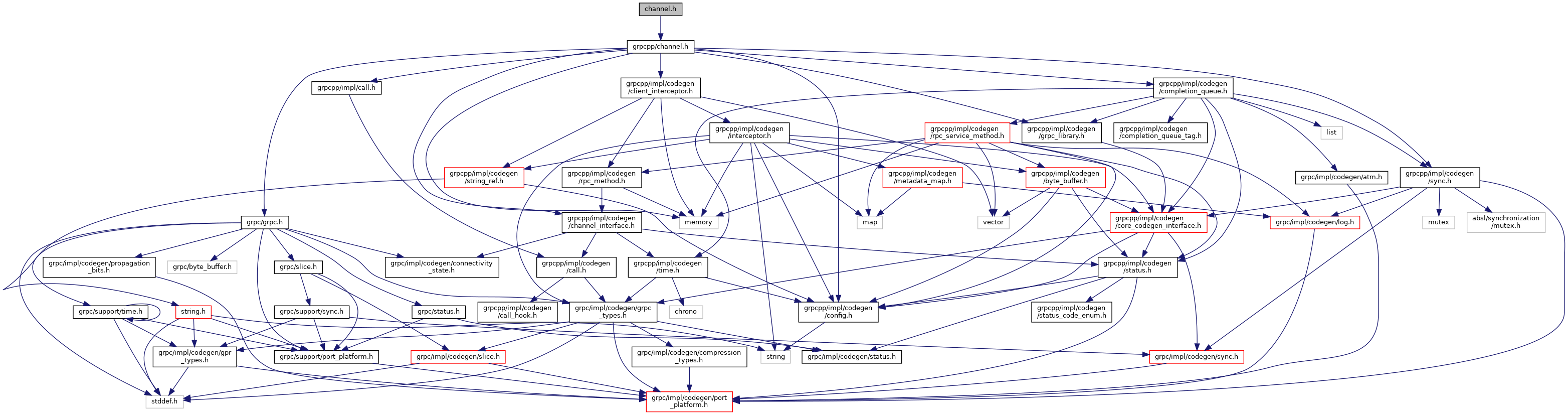 Include dependency graph for include/grpc++/channel.h: