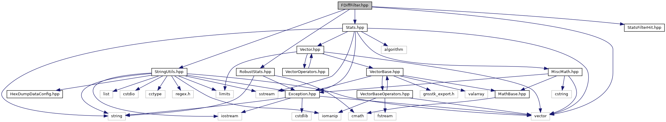There are several statistical filters implemented as classes. These classes are templates; the template parameter should be a float (probably double); it is used to construct gnsstk::Stats<T>, gnsstk::TwoSampleStats<T> and gnsstk::SeqStats<T>, which are fundamental to these algorithms. All the filters look for outliers and discontinuities (slips) in a timeseries. The first difference filter analyses the simple first difference of the data. The window filter uses a 2-pane sliding window centered on the data point in question; statistics on the data in each to the 2 panes are computed and used in the analysis. All filters' analysis() function computes a vector of FilterHit objects named 'results'that give the caller the results of the filtering. All filters have a getStats(FilterHit) function that computes statistics on the filter quantities (NOT the data) over the interval covered by the event, and stores them in the FilterHit. These stats are slightly different for the two filters; FirstDiffFilter::getStats computes min, max, median and mad of the first differences.