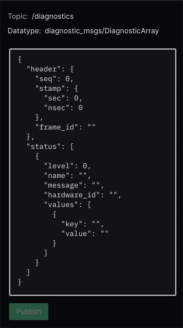 Specify the topic you want to publish on to infer its datatype and populate the text field with a JSON message template.