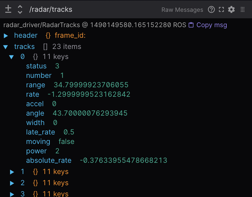As new messages are received for a given path, the collapsible tree will show just the latest message. You will be able to expand and collapse keys, and have those changes persist across playback.