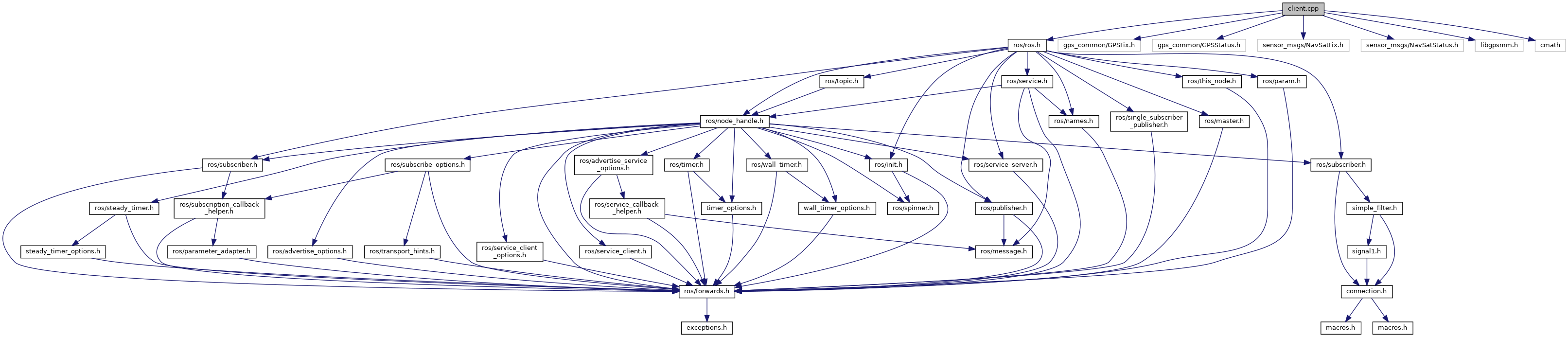 #include <ros/ros.h>#include <gps_common/GPSFix.h>#include <gps_common/GPSStatus.h>#include <sensor_msgs/NavSatFix.h>#include <sensor_msgs/NavSatStatus.h>#include <libgpsmm.h>#include <cmath>
