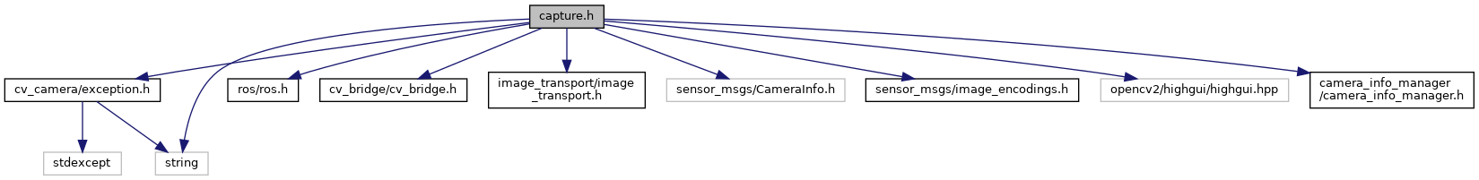 #include "cv_camera/exception.h"#include <string>#include <ros/ros.h>#include <cv_bridge/cv_bridge.h>#include <image_transport/image_transport.h>#include <sensor_msgs/CameraInfo.h>#include <sensor_msgs/image_encodings.h>#include <opencv2/highgui/highgui.hpp>#include <camera_info_manager/camera_info_manager.h>