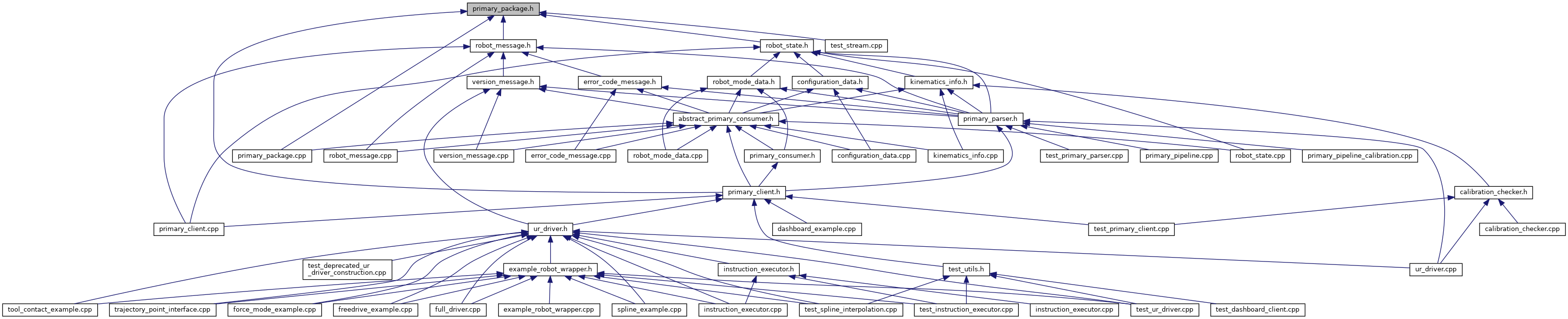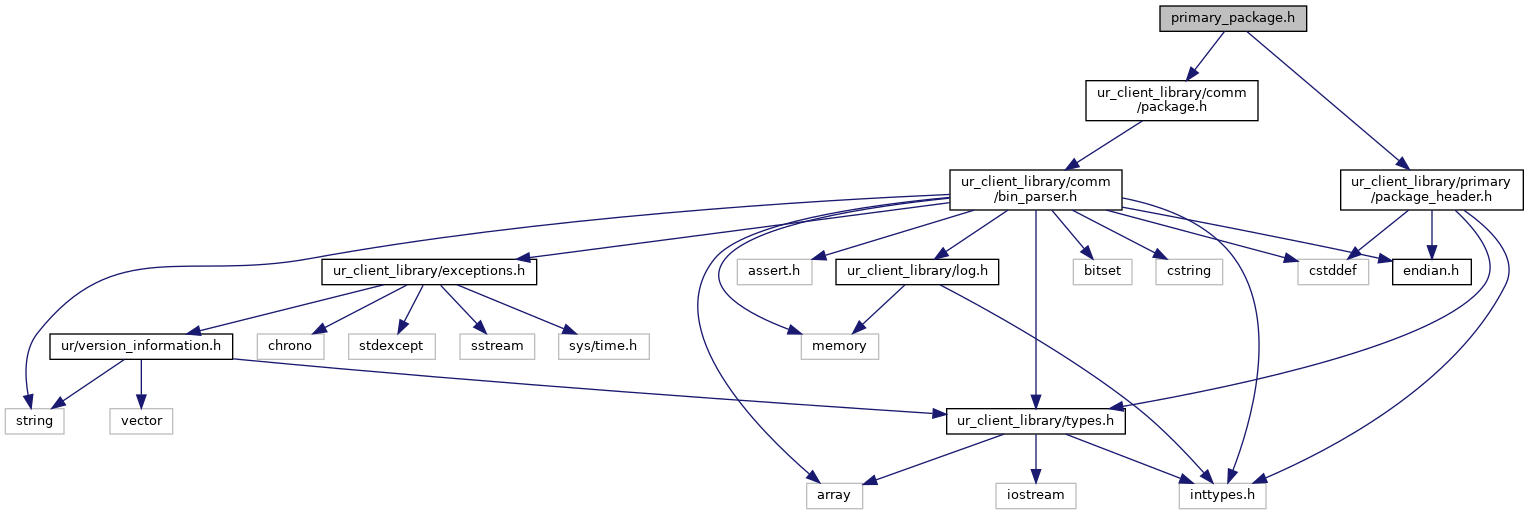 The PrimaryPackage is solely an abstraction level. It inherits form the URPackage and is also a parent class for primary_interface::RobotMessage, primary_interface::RobotState. More... | |