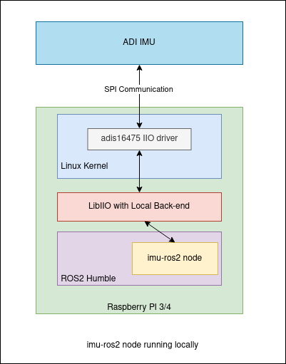 The image below shows the information flow from the IMU up to the adi_imu node when using a local client.
